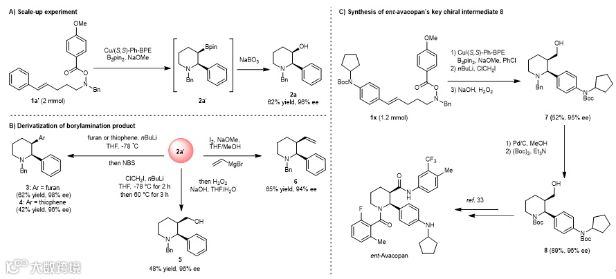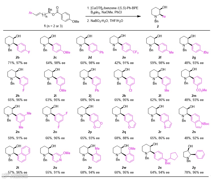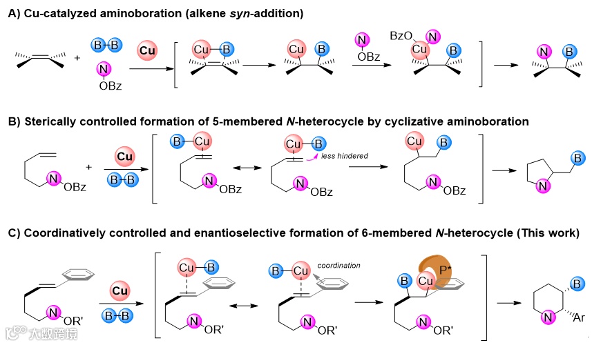 中国科学院上海有机化学研究所汤文军课题组联合上海师范大学周庆海课题组发展了高效的铜催化不对称环化硼胺化反应,高非对映选择性和对映选择性地构建了一系列手性顺式2, 3-二取代哌啶类化合物。研究团队利用易得的含酰氧胺基团的芳基烯烃为原料一步构筑顺式2,3-哌啶结构 (图2C),通过在硼-铜(I)物种对双键加成过程中引入芳基配位作用,有效控制了反应的区域选择性。