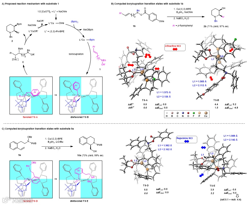 基于铜催化硼化反应的相关研究,该团队提出了当前环化硼胺化反应的合理机制。在碱和(BPin)2存在下,铜催化剂首先生成活性铜-硼物种,随后与烯烃底物发生碳碳双键迁移插入 (硼铜化),形成烷基铜中间体C。该中间体继而发生环化碳氮成键过程,生成产物2并再生活性铜催化剂。其中硼铜物种对双键的插入过程是对映选择性的决定步骤,DFT计算揭示了底物与铜催化剂间的非共价相互作用在立体控制中的关键作用 (图5)。