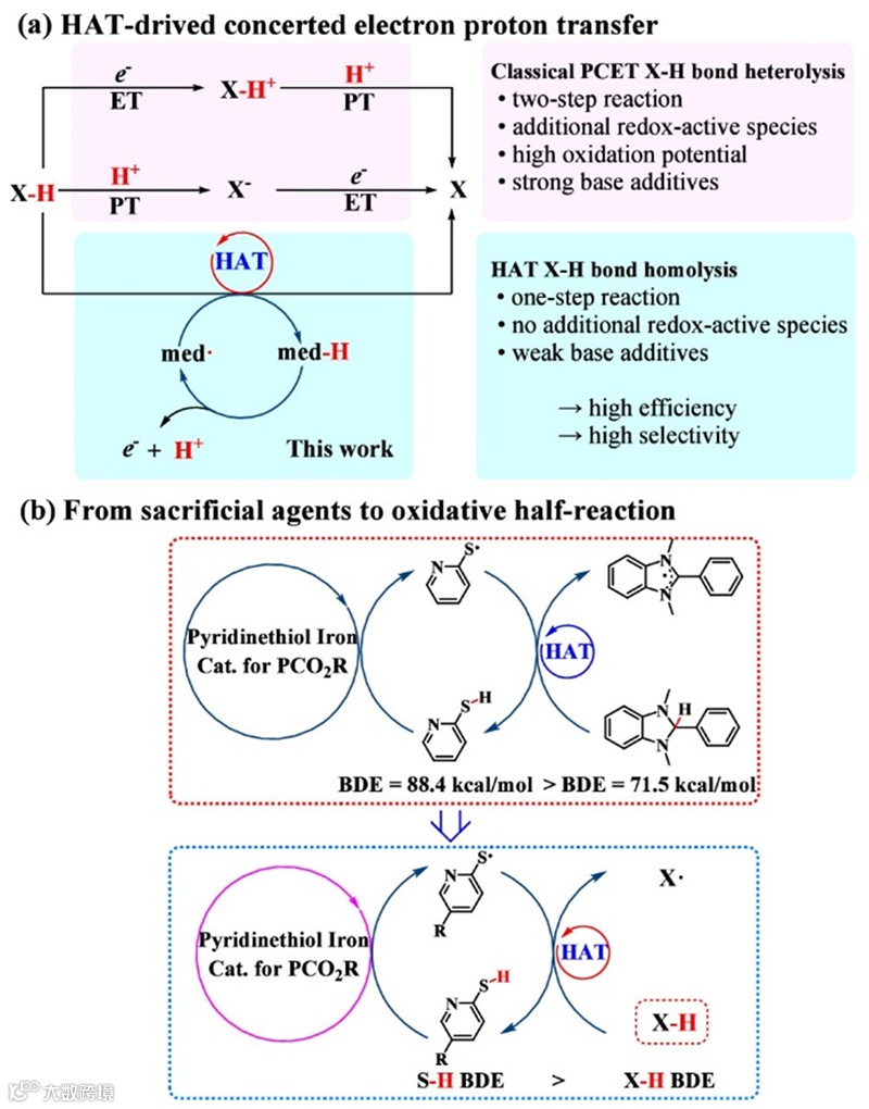 相比传统的分步质子耦合电子转移(PCET)过程,氢原子转移(HAT)机制通过一步反应同时实现电子和质子的转移,有效避免了活性中间体的积累和反向电子转移(图2a)。吡啶硫醇在反应中既通过S–H键均裂生成硫自由基推动底物C–H键活化,又作为配体与铁中心协同参与CO2还原过程(图2b)