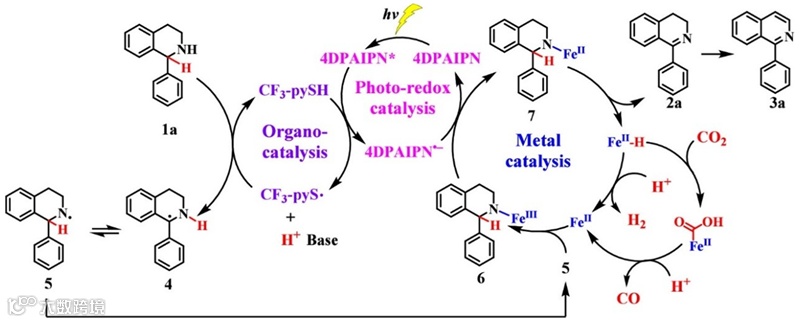 图7. 吡啶硫醇铁催化体系促进N-杂环脱氢与CO2光还原耦合的机理