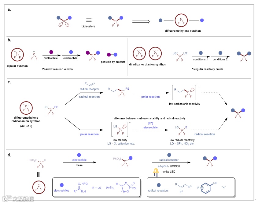 在众多含氟官能团中,二氟亚甲基(-CF2-)因其作为氧原子的生物等容体这一特性,在药物化学领域有日益广泛的应用(图1a)。传统上,含二氟亚甲基化合物(R1-CF2-R2)的合成通常依赖于对预先官能化骨架的直接氟化,存在底物适用范围受限的问题。化学家一直致力于探索以模块化的方式在二氟亚甲基的两端连接两个不同的组分,从而构建含二氟亚甲基化合物。二氟卡宾可作为二氟亚甲基偶极合成子,其串联反应在二氟亚甲基合成子策略中得到了最广泛的应用,但该策略受制于亲核试剂与亲电试剂之间的潜在副反应。虽然二氟亚甲基双自由基合成子和双负离子合成子也已被开发,但单一的反应模式限制了其产物结构的多样性(图1b)。相比之下,具有两种正交的反应模式的二氟亚甲基自由基负离子合成子(difluoromethylene radical anion synthon, diFRAS,•CF2−)在构建含二氟亚甲基化合物方面展现出独特优势。然而,该策略的实现存在以下难点:在亲电试剂的引入过程中,二氟烷基碳负离子的产生存在困难;且即使成功产生,由于负氟效应,在缺少辅助基团的情况下二氟烷基碳负离子反应性也较低。而若优先进行极性反应,则需平衡碳负离子稳定性与后续的自由基反应性之间的矛盾——高活性的自由基前体对应的碳负离子易分解为二氟卡宾,而较稳定碳负离子对应的后续自由基反应往往难以进行(图1c)。