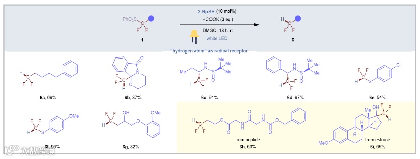 此外,该体系同样适用于PhSO2CF2H试剂本身,可使其顺利发生反应并生成二氟甲基化产物(图6)。