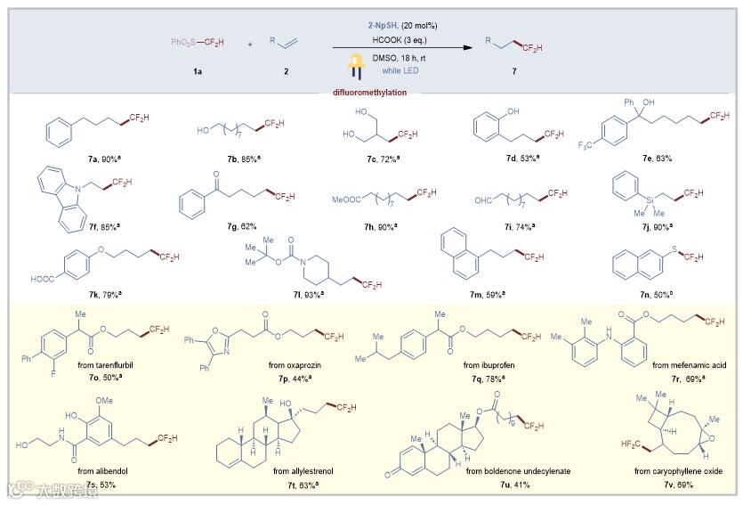 图6. 二氟甲基化的底物范围