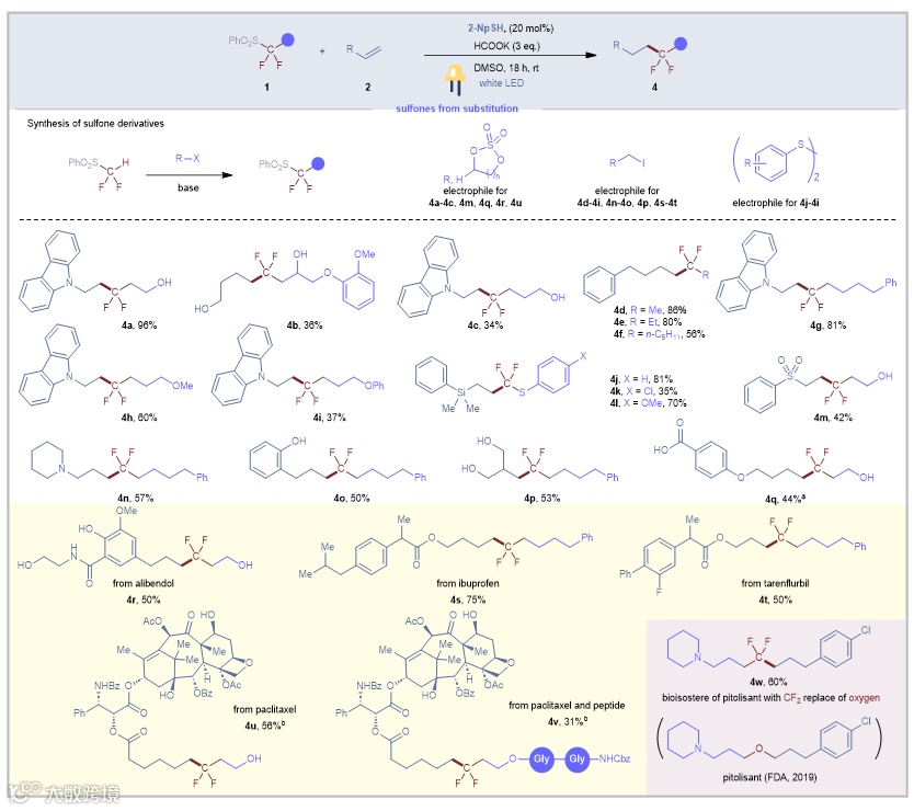 近日,中国科学院上海有机化学研究所胡金波课题组开发了一种以便宜易得的二氟甲基苯基砜(PhSO2CF2H)作为二氟亚甲基自由基负离子合成子的模块化合成策略,可在CF2两端引入两种不同组分构建含二氟亚甲基化合物,显著拓展了含二氟亚甲基化合物的多样性。作者已经开发了PhSO2CF2H与多种亲电试剂反应得到(苯磺酰基)二氟甲基化产物,这些产物组成了一个庞大的砜试剂库。然而,该试剂库中(苯磺酰基)二氟甲基的后续转化通常仅限于得到二氟甲基和偕二氟烯烃。本篇工作通过2-萘硫酚负离子作为催化剂,甲酸钾作为还原剂,能够将由PhSO2CF2H与亲电试剂反应得到的衍生物还原产生各类型二氟烷基自由基,继而与自由基受体发生后续反应,得到与亲电试剂和自由基受体连接的含二氟亚甲基化合物(图1d)。相关成果近日发表于Nature Communications上。