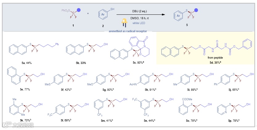图4. 以芳基硫酚作为自由基受体的底物范围