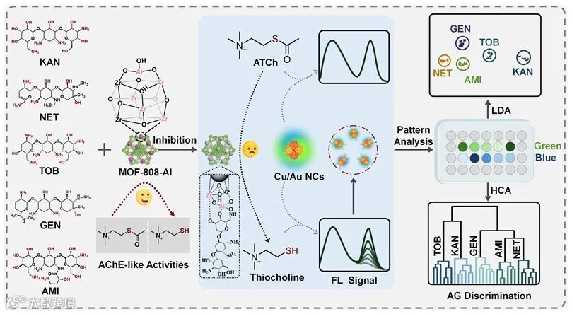 图1. 基于MOF抑制反应和硫醇响应金属纳米簇的阵列传感器及其氨基糖苷类抗生素鉴别检测应示意图。图片来源:Biosens. Bioelectron.