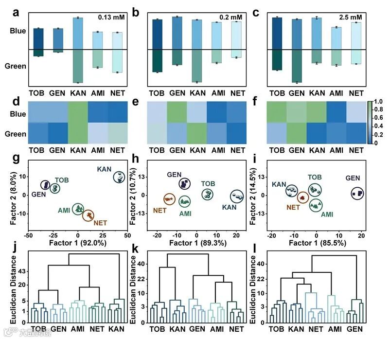 最后,研究人员基于统计分析学方法,建立了一个荧光传感器阵列,实现了AGs亚型的鉴别检测。重复测量(六次)了五种不同类型的AGs对检测体系的影响,精确记录两个通道(418 nm和525 nm波长处)的荧光强度的信号,构建一个2通道 × 5 AGs × 6重复的训练矩阵。通过热图、线行判别式分析法(LDA)、层次聚类分析法(HCA)实现了五种类型的AGs的鉴别分区与检测(如图5所示)。