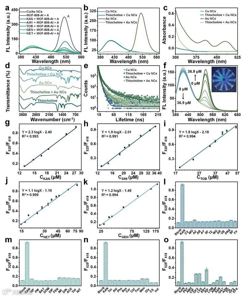 将MOF-808-Al和ATCh的反应产物引入Cu/Au NCs体系,引起了绿色区域荧光强度的下降,蓝色区域观察到荧光强度相对稳定。借助AGs对MOF-808-Al的类AChE活性的抑制作用,引入AGs导致猝灭的绿色荧光恢复。Cu/Au NCs绿色与蓝色荧光强度比值与5种AGs的浓度具有良好的线性关系。该方法对多种干扰物和抗生素具有良好的选择性和抗干扰能力(如图4所示)。
