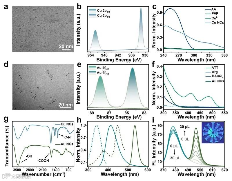 研究人员首先对混合纳米团簇进行了表征,通过TEM、XPS、FTIR和UV等表征手段证实了材料成功合成(如图2所示)。通过控制Au NCs的添加量,可以精确地调节Cu/Au NCs的蓝色和绿色发射组分之间的比例,表明其作为荧光比率探针的应用前景。