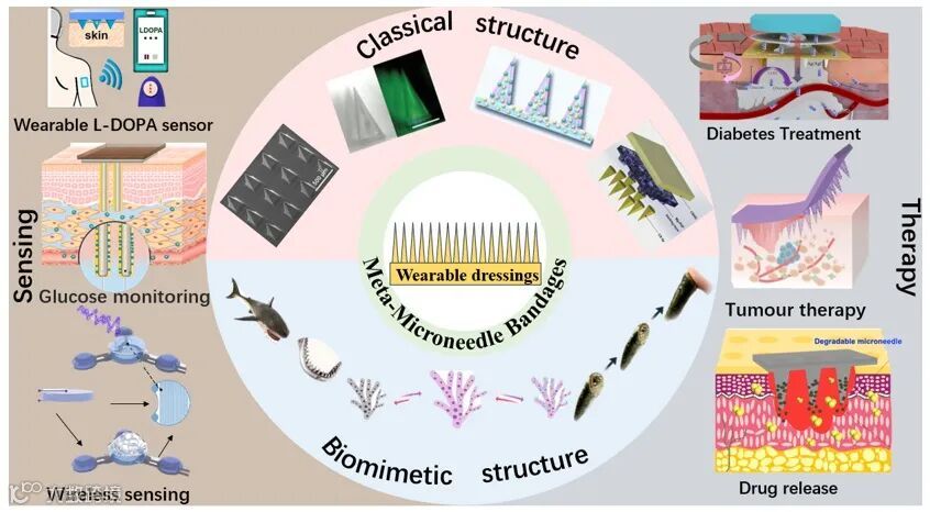 图1. 传统与仿生结构微针敷料在生物传感领域的综合应用。