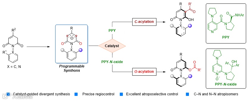 近期,郑州大学邓瑞显课题组利用对称烯醇负离子作为可编辑合成子,开发出一种催化剂控制的可切换不对称C/O-酰基化策略,实现了N-C和N-N轴手性吡啶酮类化合物的发散式合成(图2)。这一策略的关键在于开发新型手性4-吡咯烷基吡啶(PPY)衍生物及PPY-N-氧化物作为正交的酰基转移催化剂,PPY选择性促进了极具挑战性的直接C-酰化反应,而PPY-N-氧化物则专一地介导O-酰化反应。相较于传统酰基转移催化剂主要局限于中心手性构建,新型催化剂凭借其出色的阻旋选择性控制能力,显著拓展了该类催化剂可构建的手性分子体系范围。
