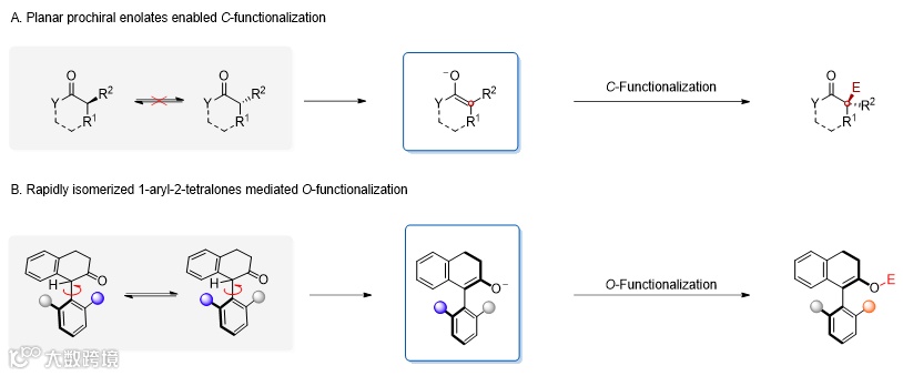 烯醇负离子是一类重要的反应中间体,其α-碳原子的sp2杂化特性使其具有平面构型。基于这一前手性平台分子的不对称C-官能团化反应(如芳基化、烷基化、烯基化、Aldol反应以及共轭加成等,图1A)已成为不对称合成领域的重要策略。近年来,利用1-芳基-2-四氢萘酮类化合物快速异构的特性,基于其烯醇中间体的动态动力学不对称O-官能团化策略,已发展成为合成阻旋异构体的有效方法(图1B)。因此,开发新型反应平台对拓展不对称合成具有重要意义。此外,作为双亲核试剂,烯醇负离子转化的区域选择性控制一直是合成化学中的挑战;而通过实现其区域选择性的C/O-官能团化反应,可为复杂分子的发散性合成建立新的方法。