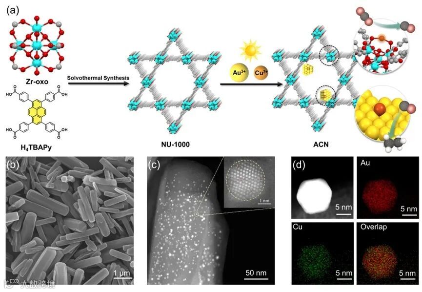 作者利用NU-1000具有开放通道与Zr-oxo节点的结构优势,采用原位光还原策略,将Au和Cu前驱体同时引入在MOF内部,得到ACN材料。一方面,Cu单原子被精准锚定在Zr节点上,形成孤立活性位点;另一方面,Cu也成功掺杂进Au纳米颗粒中,形成Cu-Au合金纳米结构。通过SEM与HAADF-STEM成像及元素Mapping分析,清晰展示了Cu与Au在MOF孔道中的空间分布和协同存在,为后续的功能分工和反应路径协同打下了结构基础。