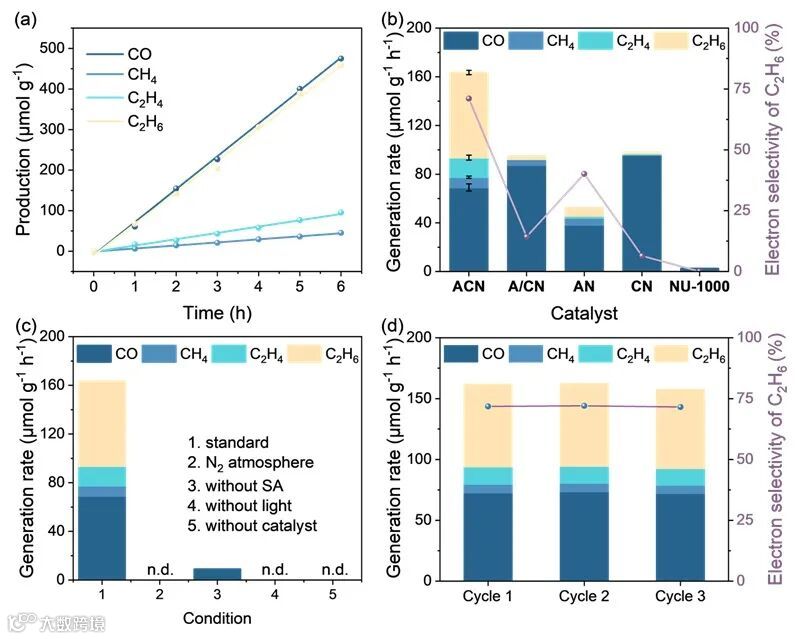 图3.(a)以ACN为催化剂的CO2还原产物生成速率;(b)使用不同催化剂(ACN、A/CN、AN、CN、NU-1000)的性能对比;(c)ACN的反应条件控制实验结果;(d)ACN的循环稳定性测试(每轮3小时)。