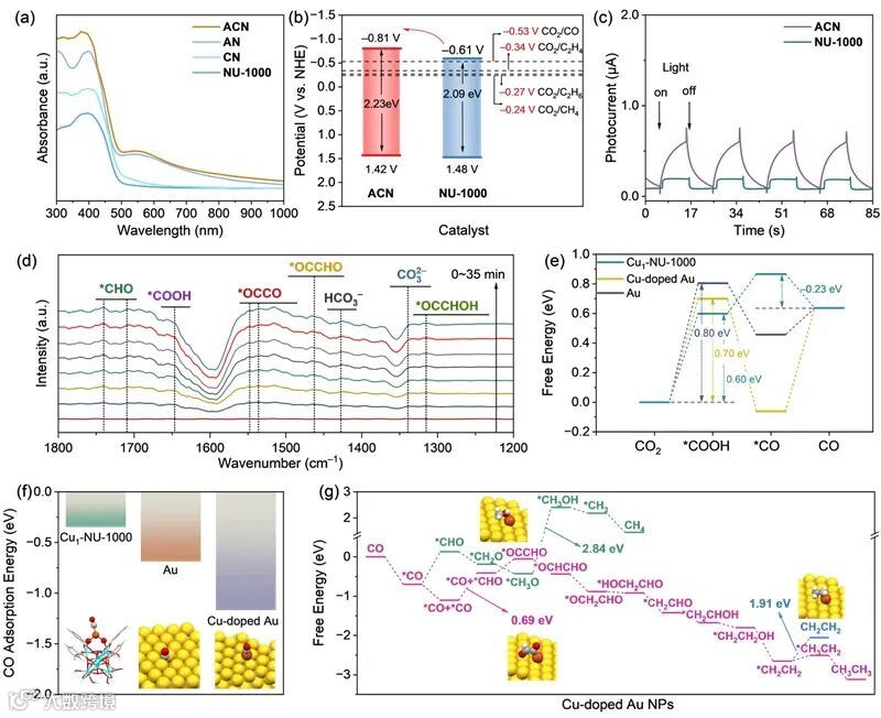 图4.(a)ACN、AN、CN和NU-1000的紫外-可见吸收光谱;(b)ACN和NU-1000的能级结构及各CO2还原路径的电位;(c)ACN和NU-1000的光电流响应;(d)ACN在反应过程中的原位FTIR光谱;(e)不同催化位点CO2还原为CO的自由能变化;(f)三种位点对CO吸附能;(g)Cu掺杂Au上的C1→C2产物生成的自由能路径