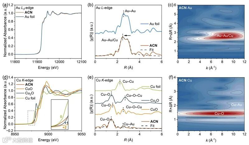 图2.(a)ACN与金属Au箔的Au L3边XANES光谱;(b)Au箔、ACN的Au L3边EXAFS光谱及其拟合曲线;(c)ACN的Au L3边小波变换(WT)EXAFS图;(d)ACN、Cu箔、Cu2O和CuO的Cu K边XANES光谱;(e)上述样品的Cu K边EXAFS光谱及ACN拟合曲线;(f)ACN的Cu K边WT-EXAFS图。