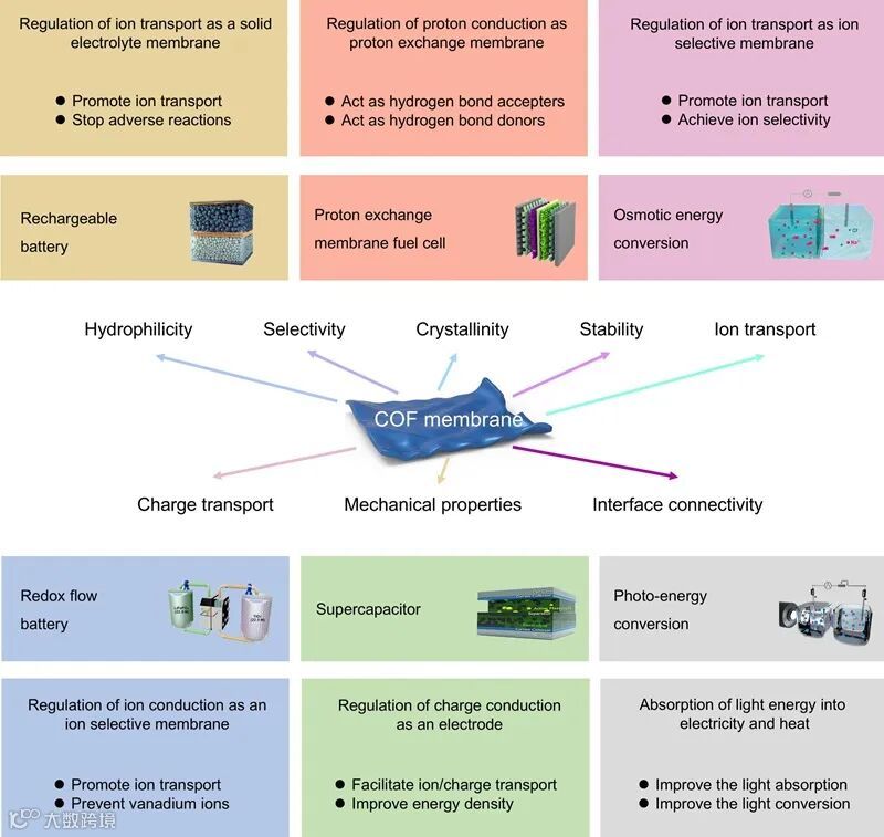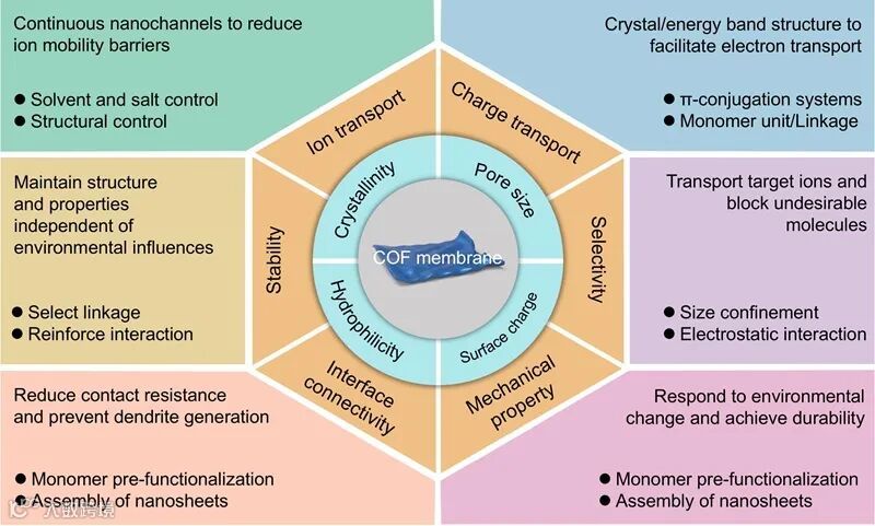 图2. 用于能源储存和转换COF膜的关键要求和设计原则示意图