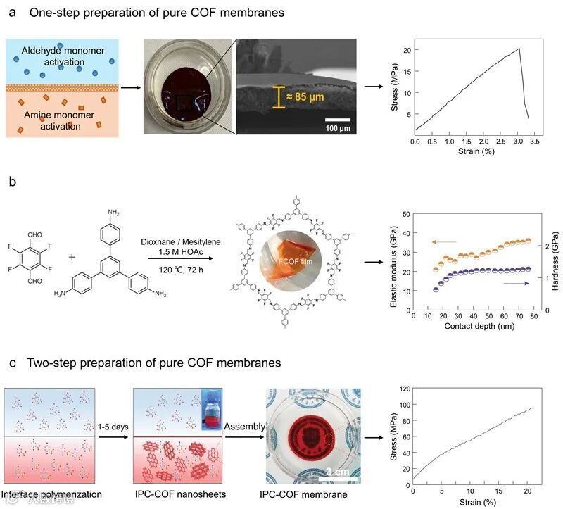 图6. 构建具有高机械强度的纯相COF膜的策略:一步制备、两步制备