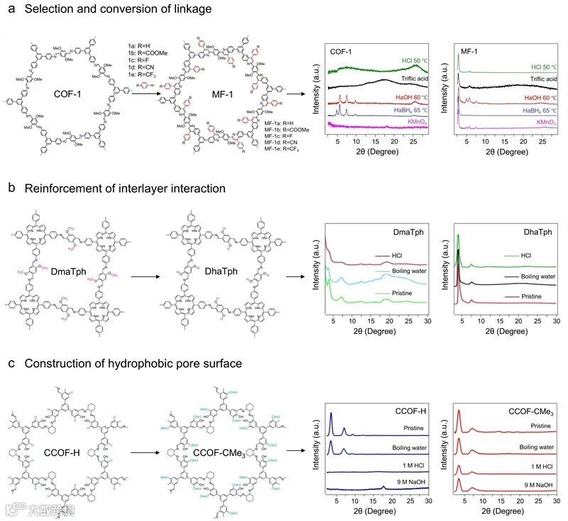 图5. 构建高化学稳定性COF膜的策略:连接键的选择和转换、层间相互作用的强化和疏水孔道的构建