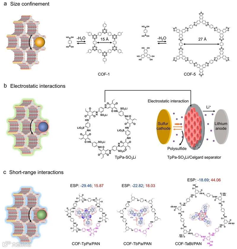图4. COF膜中离子/分子选择性的类型:尺寸限制、静电相互作用和短程相互作用
