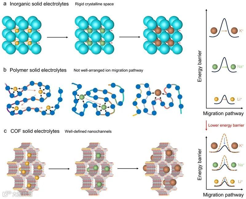 图3. 离子在无机固态电解质、聚合物固态电解质和COF固态电解质的传导机制