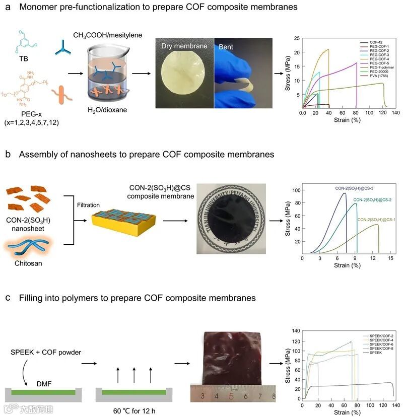 图7. 构建具有高机械强度的COF复合膜的策略:单体预功能化、纳米片自组装、聚合物共混