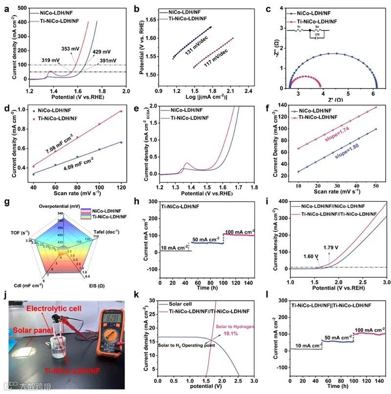 石河子大学于锋教授团队创新性地采用一种TiCl4快速浸渍法(时间为30 s),制备了钛掺杂的NiCo-LDH电催化剂。该催化剂富含M-O-Ti(M=Ni, Co)键与氧空位,显著增强了析氧反应过程中含氧中间产物的吸附能力,大幅提升电子转移速率,有效降低了反应中最为关键的决速步(RDS)所需能量,有效促进了 OER 反应动力学,从根本上提升了催化剂的性能。钛掺杂的Ti-NiCo-LDH 催化剂展现出了优异的电化学性能,其过电位(353 mV@100 mA/cm2)显著优于未掺杂的NiCo-LDH催化剂(429 mV@100 mA/cm2)。与太能电池组合,在 1.61 V 电压下即可高效驱动水分解,充分彰显了其在实际应用中的巨大潜力与广阔前景。