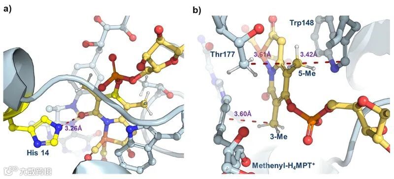 随后通过对单铁氢酶晶体结构的分析发现,3-甲基通过范德华作用与底物(methenyl-H4MPT+)上的苯环作用,限制了金属辅因子和底物的运动,促进了氢化物转移。5-甲基与蛋白中 Thr177 和 Trp148 残基形成紧密的空间相互作用,稳定了辅因子在蛋白腔中的构象,最终给活性和稳定性带来了提升(图4)。而4-OH 基团与鸟苷的磷酸基团存在空间排斥,最终导致了稳定性和活性的下降。