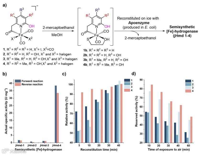 合成了仿生配合物1-4后(其中仿生配合物1为对照,参考Nat. Chem., 2015, 7, 995–1002),与大肠杆菌表达的脱辅酶经过重组得到了一系列半合成单铁氢酶,并分别测定了它们正向(氢化)与反向(脱氢)反应活性、重组速率、空气稳定性及反应动力学参数。结果显示,引入3-甲基后,半合成单铁氢酶 jHmd-4 的催化活性较无3-甲基类似物jHmd-3提升了约35倍,正向/反向反应活性分别达 38.5和33.5 U・mg-1,是目前半合成单铁氢酶最高纪录(表1)。此外,3-甲基的存在加速了模型配合物与脱辅酶的重组速度,在重组5分钟内便达到了其终活性的90%以上,这一速度接近天然FeGP辅因子于脱辅酶的重组速度(图3c)。相较于jHmd-1,吡啶上引入4-羟基后重组得到的jHmd-2活性明显下降,其活性不足jHmd-1的一半。而在引入5-甲基后,活性从jHmd-2的0.7 ± 0.2 U・mg-1(正向)与0.3 ± 0.1 U・mg-1(反向)提升至1.1 ± 0.2 U・mg-1(正向)和1.1 ± 0.1 U・mg-1(反向)(表1)。有意思的是,5-甲基虽然未大幅提升半合成单铁氢酶的活性,但却给半合成酶的空气稳定性带来了显著提升——暴露于空气中 30 分钟后,jHmd-3和jHmd-4仍保留了约 65% 活性,而jHmd-1和jHmd-2的活性已降至初始活性的40%左右(图3d)。