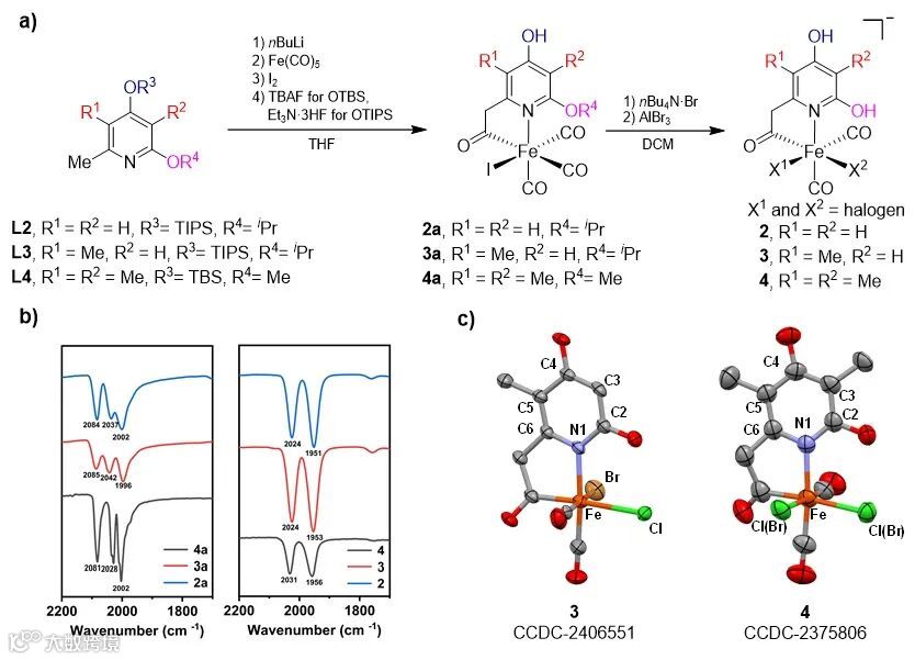 图2. a) 仿生配合物的合成路线;b) 仿生配合物的红外光谱;c) 仿生配合物3-4的晶体结构。图片来源:J. Am. Chem. Soc.