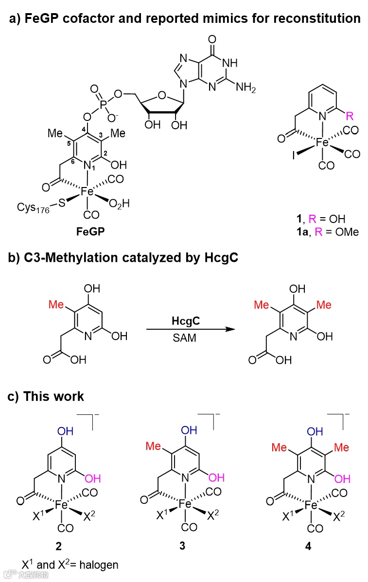 图1. a) FeGP辅因子的结构和过去报道的仿生配合物结构;b) 生物体内天然金属辅因子合成过程中的甲基化过程;c) 本文中合成的仿生配合物。图片来源:J. Am. Chem. Soc.