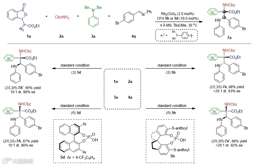 随后,作者尝试引入第四组分亲电试剂对上述的活泼中间进行捕捉。经筛选发现手性磷酸活化的亚胺可作为亲电试剂对活泼中间体进行有效捕捉,得到具有两个连续手性中心的α,β-二氨基-3-芳基丙酸衍生物。此外,在优化反应条件过程中发现使用不同类型的手性磷酸能实现反应的非对映选择性翻转。通过更换手性磷酸催化剂,实现了α,β-二氨基-3-芳基丙酸衍生物的立体发散性合成。