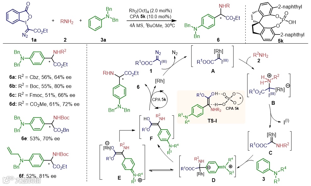 基于以上研究,作者设想在反应中使用两种不同类型的亲核试剂(N-亲核试剂和C-亲核试剂),首先研究了金属卡拜等价物与不同类型亲核试剂的交叉插入反应,经过初步的筛选实现了高价碘重氮试剂、氨基甲酸酯与N,N-二烷基苯胺的三组分反应,通过加入催化量的手性磷酸能以中等的收率和对映选择性得到三组分产物α-氨基酯。
