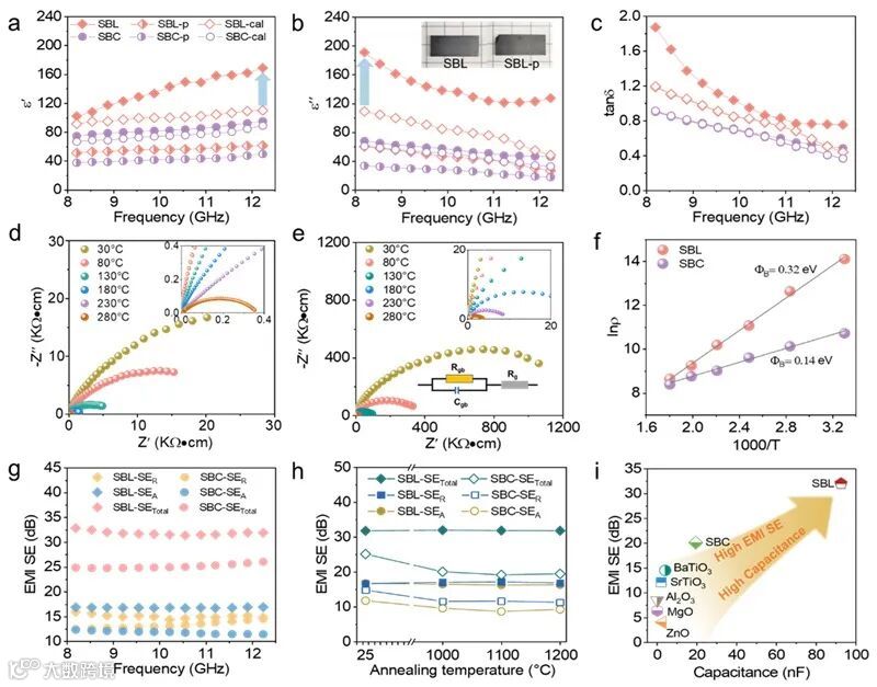 图2. 中熵钙钛矿陶瓷的介电性能与电磁屏蔽性能。(a-c)中熵钙钛矿粉体、陶瓷及理论块体材料的介电常数(ε')、介电损耗(ε'')及损耗角正切(tanδ)的频率依赖性。(d-e) SBC与SBL钙钛矿陶瓷在不同温度下测量的阻抗奈奎斯特图。(f) SBC和SBL陶瓷的晶界势垒高度。(g) X波段室温测量的中熵钙钛矿陶瓷电磁屏蔽效能。(h)不同温度退火处理后中熵钙钛矿陶瓷的电磁屏蔽效能。(i)各类氧化物陶瓷电磁屏蔽性能与电容特性的对比分析。