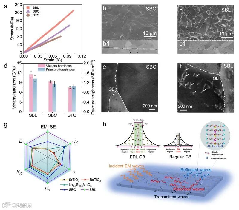 ,类似于背靠背的双电层超级电容器结构。这种双电层结构的晶界增加了陶瓷的偶极子极化和极化损耗,导致了陶瓷大的复介电常数和介电损耗,从而导致在X波段的总电磁屏蔽效能高达32 dB以上,即使在1200 ℃空气中退火后仍能保持稳定。(3)这种具有高水平空位偏析的独特晶界导致了SBL陶瓷的断裂方式为沿晶断裂,这不仅提高了其断裂韧性,还增强了其弯曲强度。该研究创新性地提出了一种兼具优异力学性能与电磁屏蔽功能的新型材料设计策略,其突出的环境耐受性使其在航空发动机及可回收火箭等极端工况下具有重要应用前景。