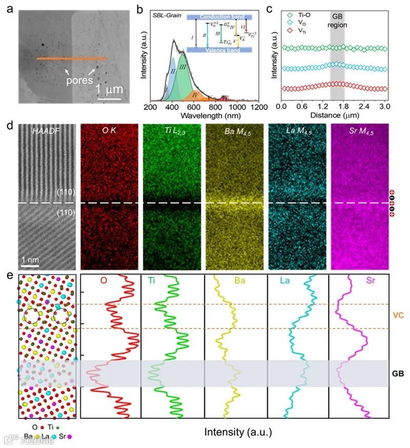 图3. 晶界空位偏析特性。(a)SBL陶瓷抛光表面SEM图像。(b)SBL陶瓷阴极发光(CL)特征,插图为带隙缺陷态发光过程的微观机制示意图。(c)SBL陶瓷CL光谱线扫描结果。(d)晶界区域的HAADF-STEM图像及O、Ti、Ba、La、Sr元素的EELS面分布图。(e)通过遗传算法结合蒙特卡洛-分子动力学混合方法模拟得到的弛豫晶界超胞原子结构,附有垂直于晶界面的元素分布剖面图;VC表示空位团簇,黑色圆圈代表块体材料内部空位聚集形成的微孔。