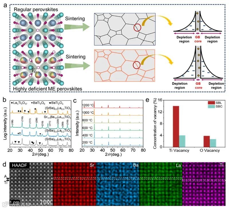 图1. 中熵钙钛矿陶瓷的物相与结构。(a)传统与高缺陷中熵钙钛矿陶瓷烧结后晶界差异示意图。(b)随La含量增加的钙钛矿陶瓷XRD图谱。(c)SBL陶瓷随退火温度升高的XRD图谱。(d)SBL钙钛矿的HAADF-STEM图像及元素分布原子级EDS图谱。(e)SBL与SBC陶瓷中Ti空位和O空位浓度对比。