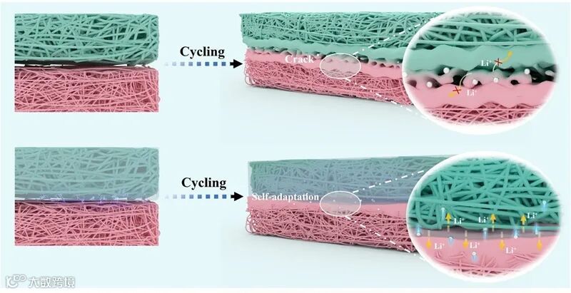 电池界面问题是当前电化学储能研究中的核心挑战之一,尤其在高能量密度锂氧气电池中尤为突出。不良的接触界面不仅会引起界面阻抗升高,还会导致锂离子传输路径不连续,严重制约电池的离子迁移动力学,从而降低倍率性能与循环稳定性。因而,开发和设计自适应界面结构,以动态调控界面状态并实现电极与电解质之间的稳定接触与连续的离子传输,已成为实现高性能电池的关键策略。