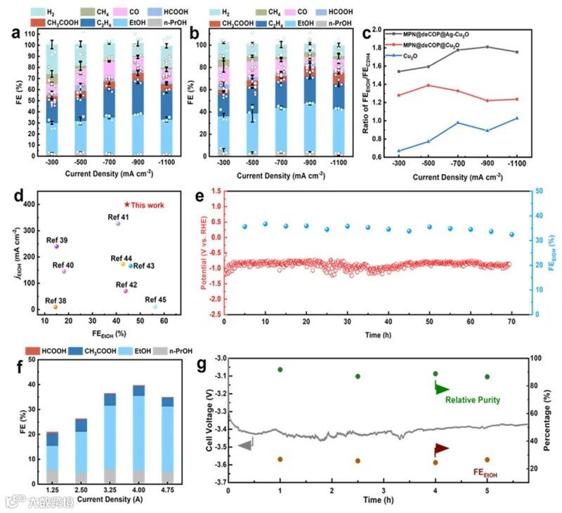 图3. CO2RR性能。a-b,MPN@deCOP@Cu2O(a)和MPN@deCOP@Ag-Cu2O(b)在不同电流下产生的各种产物的法拉第效率(FE)。c,乙醇法拉第效率(FEEtOH)与乙烯(FEC2H4)法拉第效率的比值随电流密度的变化。d,乙醇法拉第效率和乙醇部分电流密度(jEtOH)与最先进的铜CO2RR催化剂的对比。e,MPN@deCOP@Ag-Cu2O在500 mA cm-2下的长期稳定性。本图中所有电势均经过iR校正(MPN@deCOP@Ag-Cu2O的电阻R=1.53 Ω)。f,在25 cm2膜电极组件(MEA)电极上,总电流范围为1.25 A至4.75 A时,二氧化碳转化为液态产物的法拉第效率。g,在25 cm2膜电极组件电解槽中,以10 A的恒定电流运行5.8 h期间的FEEtOH、相对纯度和电池电压。误差棒代表至少三次独立测量的标准偏差。图片来源:AEM