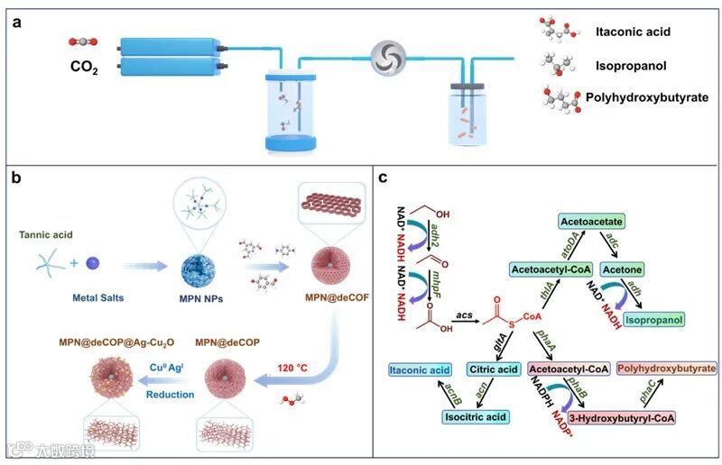 此项创新的核心在于电催化转化系统和微生物发酵系统的模块化设计(图1a)。在电催化转化系统中,利用单宁酸(TA)构建的金属-多酚络合物(MPN)纳米颗粒为核在较低的温度下合成了氨基缺陷的共价有机聚合物催化平台,通过原位还原和空间限域制备了银(Ag)和氧化亚铜(Cu2O)纳米颗粒,作为电催化转化系统的级联催化位点(图1b)。在电力驱动下,该电催化系统在5×5 cm2的膜电极(MEA)反应器中实现了乙醇的高选择性和高电流密度的运行。产生的乙醇作为碳源供给工程化大肠杆菌(E. coli)菌株,进而被转化为具有工业价值的产品,如衣康酸、异丙醇和聚羟基丁酸酯(PHB)(图1c)。