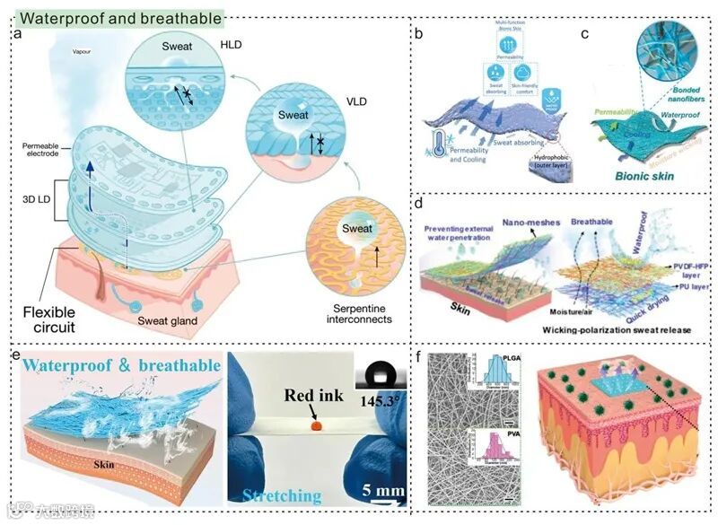 众所周知,人体皮肤通过水分蒸发实现排汗这一重要生理功能。然而,传统不透气的e-skin会严重阻碍皮肤与环境之间的气体交换,导致汗液在器件/皮肤界面不断积聚。这种水分积累不仅会显著降低界面粘附强度,引发器件移位甚至脱落等问题,还会因电荷屏蔽效应导致TENG基e-skin的输出性能和传感信号明显衰减。更为严重的是,长期密闭环境可能引发皮肤不适甚至炎症反应。因此,在TENG基电子皮肤的研发中,实现优异的防水性能与透气性的协同优化,成为确保器件长期稳定工作与穿戴舒适性的关键设计要素。