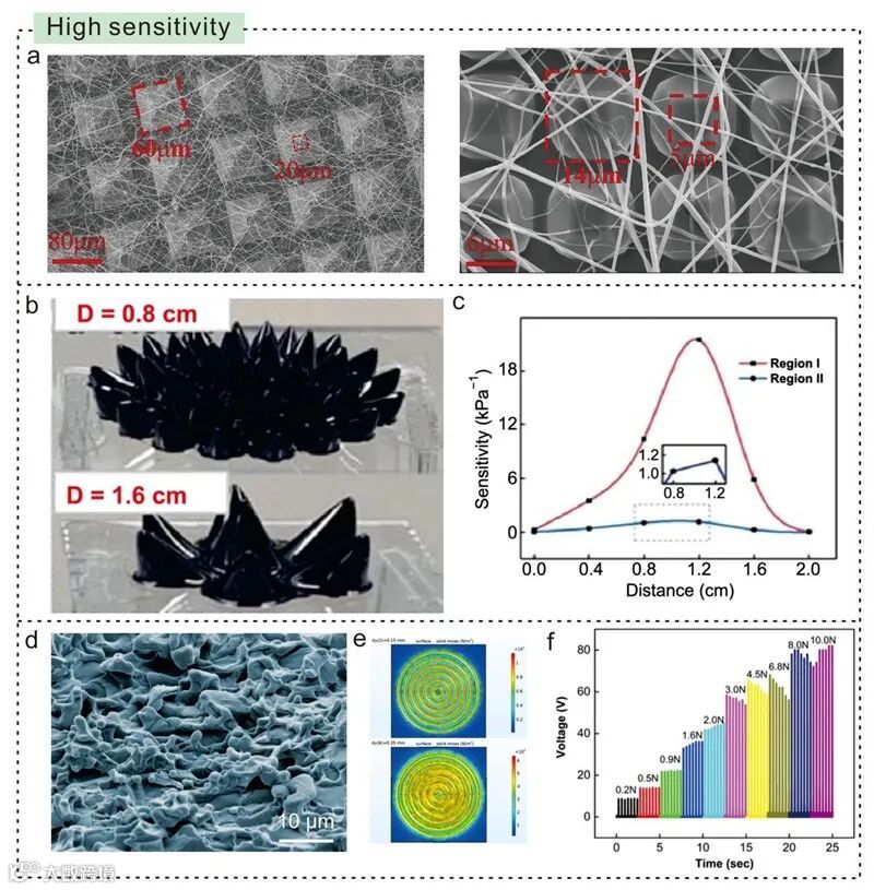高灵敏度和低检测限是自供电式e-skin在健康监测应用中的关键性能指标。研究表明,通过在摩擦电材料中构建微/纳米结构(如微柱、纳米纤维或多孔网络),可有效增强其传感灵敏度。此外,在摩擦电功能层间引入微结构设计(如表面图案化或中间层调控),能够动态优化界面电荷转移行为,从而进一步提升器件性能。这一策略已被多项研究证实是提升e-skin灵敏度的有效途径。