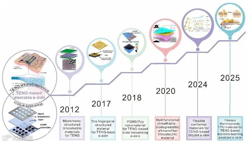 摩擦起电是一种普遍存在于两种异质界面之间的普遍电学现象,回顾近十余年的发展脉络,发现用于e-skin的摩擦电材料演进始终围绕着“结构-功能协同”这一主线不断深化。实现了从单一感知向多功能感知转变,同时向着更舒适、环境自适应与智能方向持续迈进。