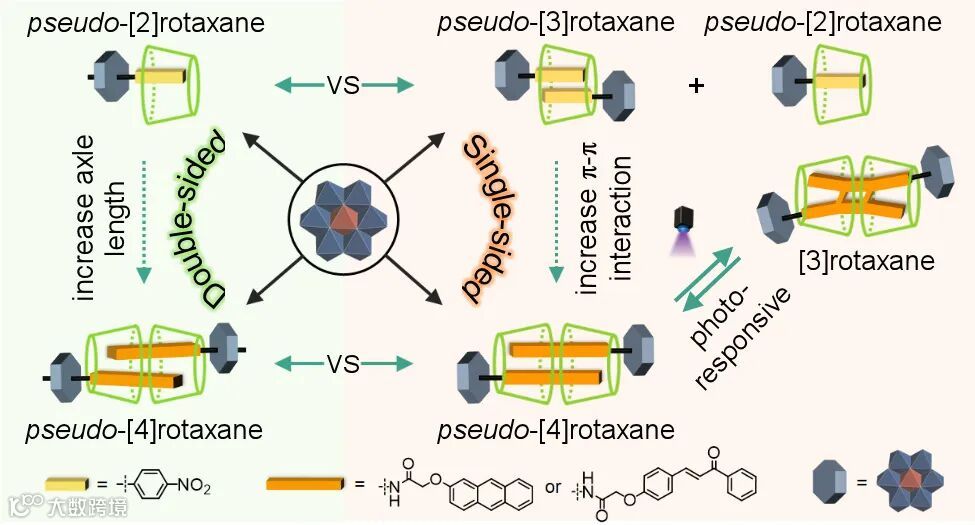 轮烷,作为机械互锁分子(Mechanically interlocked molecules, MIMs)的重要分支,是由哑铃型“轴”分子穿梭有机大环“轮”,并以大体积分子封端而构成的超分子体系。轮烷具备动态响应的特性,在催化、分子机器、室温磷光、智能材料等方面展现出巨大潜力。目前,有机轮烷的超分子研究主要集中在“轴”和“轮”分子的设计与功能化上,而大体积“封端基团”对于轮烷在溶液中的组装动力学和晶态超分子结构的影响,缺乏相应地研究。尽管近年来,金属配合物参与的有机-无机杂化轮烷引起了人们的广泛关注,但研究仍集中在由金属配合物所构成的“轮”上。