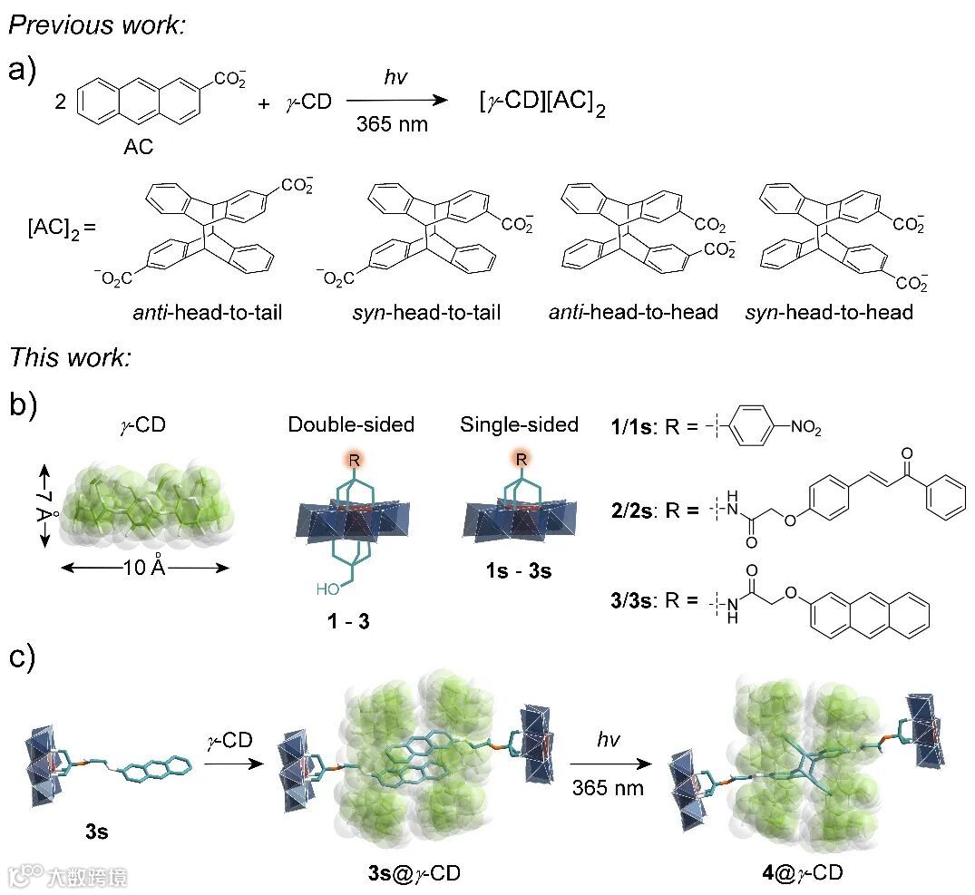 近日,北京化工大学宋宇飞/林长亘团队与英国格拉斯哥大学Leroy Cronin/龙德良团队合作,在超分子杂化轮烷领域取得突破。研究团队通过共价修饰Anderson型多酸作为“封端基团”,锚定光响应有机化合物如查尔酮、蒽等作为“轴”,与γ-环糊精(γ-CD)“轮”进行超分子组装。他们首次制备了γ-CD二聚体穿双多酸单元的准[4]轮烷单晶;通过光诱导单晶到单晶转化,制备了“反式-头碰尾”形式的蒽二聚体[3]轮烷。论文的关键突破在于利用多酸的不对称共价修饰调控氢键网络与空间位阻,实现超分子组装的精确调控,为智能分子机器的开发提供了新思路。