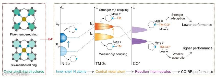 “由外而内”的设计策略阐明了外围几何效应对单原子催化剂(SACs)的两个基见解。首先,如图6所示,在外壳中安装特定的六元或五元环,通过其电子转移能力改造配位N原子的电子性质,同时调节金属中心和N原子之间的d-p耦合。值得注意的是,五元环比六元环诱导更强的d-p耦合,使金属原子的d带中心和氮原子的p带中心都更靠近费米能级。这种电子重组增强了从Fe到N的电子转移,同时减少了向CO*中间体的电子贡献,从而促进了CO*的解吸,提高了CO2RR性能。令人鼓舞的是,可以合理地设想,通过精确合成SACs外围环境中的定制环结构,可以实现更优异的催化性能。