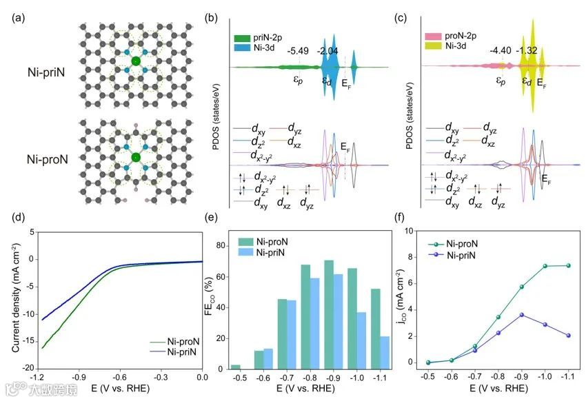 图5. Ni-priN和Ni-proN的结构模型,电子结构分析以及CO2RR性能分析
