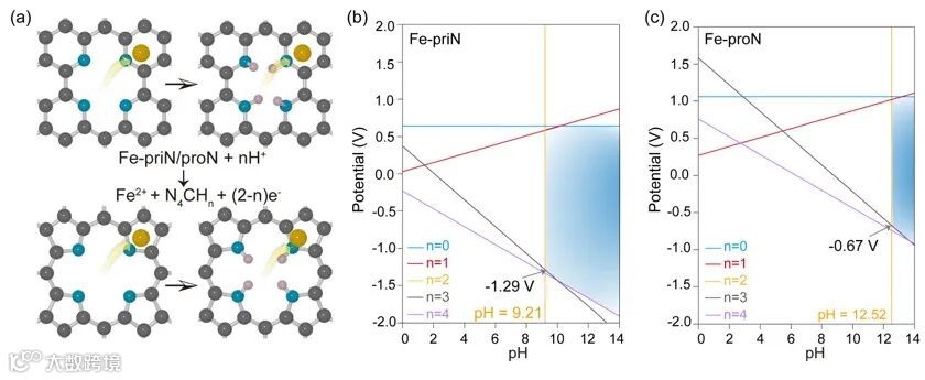 图2探究了在不同的电化学条件下,具有外围六元环结构的Fe-priN和具有五元环结构的Fe-proN催化剂的热力学稳定性。发现六元环结构有助于在较低pH值和更负电位下稳定Fe2+,而五元环结构则需要更强的碱性和更高的电位来提升Fe2+的稳定性。