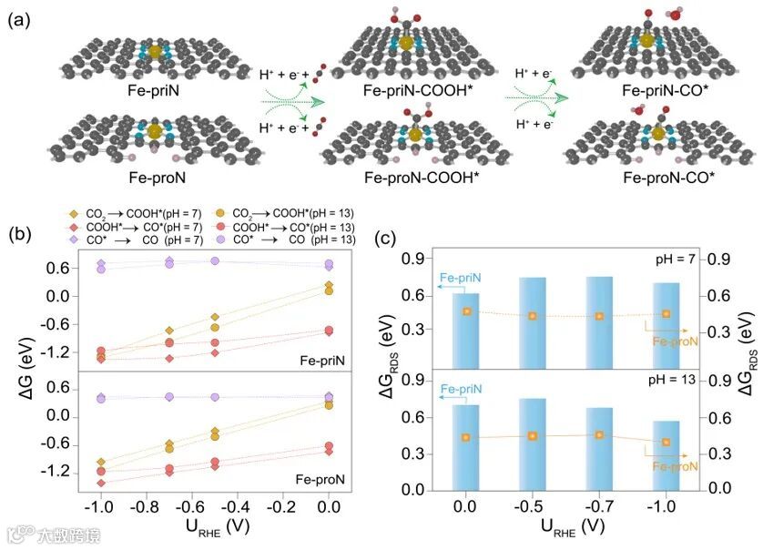 为了阐明外围几何结构对CO2RR性能的影响,作者系统计算了在不同电势和pH值下,Fe-priN和Fe-proN上CO2RR的电势-pH依赖性∆G。如图3所示,两种催化剂上发生CO2RR的限速步骤均为CO*的脱附过程。在所有电势下,Fe-proN上限速步骤的∆G始终低于Fe-priN,证明了其优异的催化效率。这一趋势表明,Fe-proN中的五元环结构优化了反应中间体的吸附强度。总而言之,Fe-proN为CO2转化为CO提供了更具热力学优势的途径,突出了外围几何结构在调节催化活性方面的关键作用。