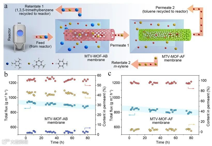 进一步,研究团队展示了该类MTV-MOF中空纤维膜的实际应用潜力。构建了多级膜分离过程,利用不同孔径的MTV-MOF膜串联,成功实现了对复杂混合物(甲苯、二甲苯、三甲苯)的高效一步分离,凸显了分离膜材料在复杂化工分离体系中的潜在应用价值。